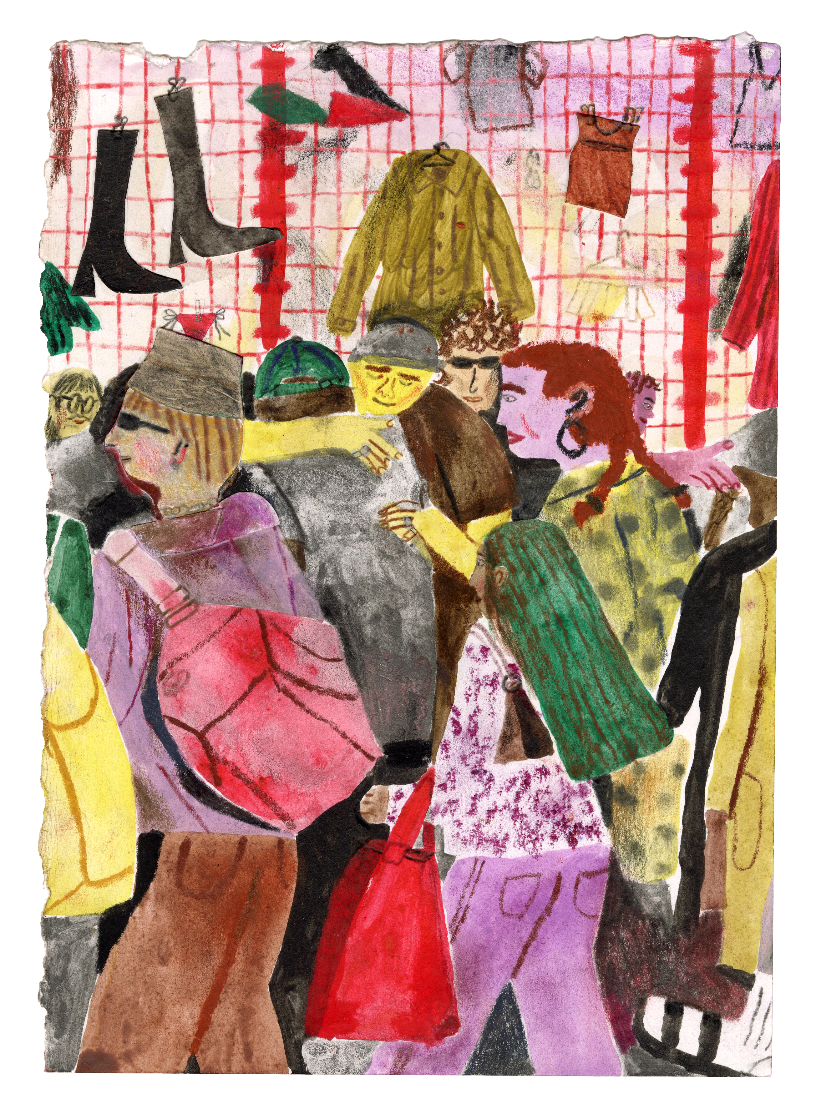 Analogue mexid media, watercolour, watercolour graphite, wax pastels, oil pastels, pencils and collageThe drawing is based on a live sketch I did while visiting Det Grønne Loppemaked in Copenhagen, Nørrebro.